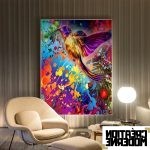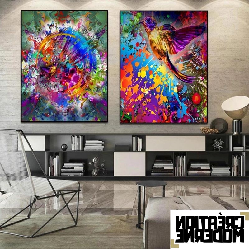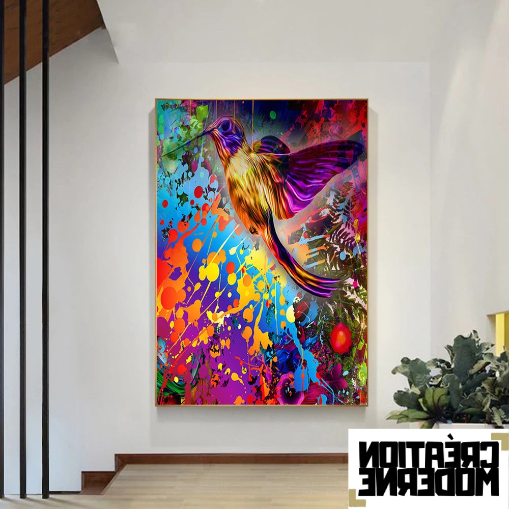 Tableau moderne coloré avec oiseau aux teintes vives, une explosion de couleurs